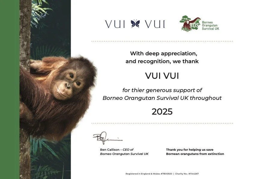 I am passionate about Vui Vui’s collaboration with, and raising awareness of, BOS-UK and hope that our contribution helps in saving endangered orangutan and the rainforests of Borneo. Without orangutan there won’t be a rainforest and vice-versa.
